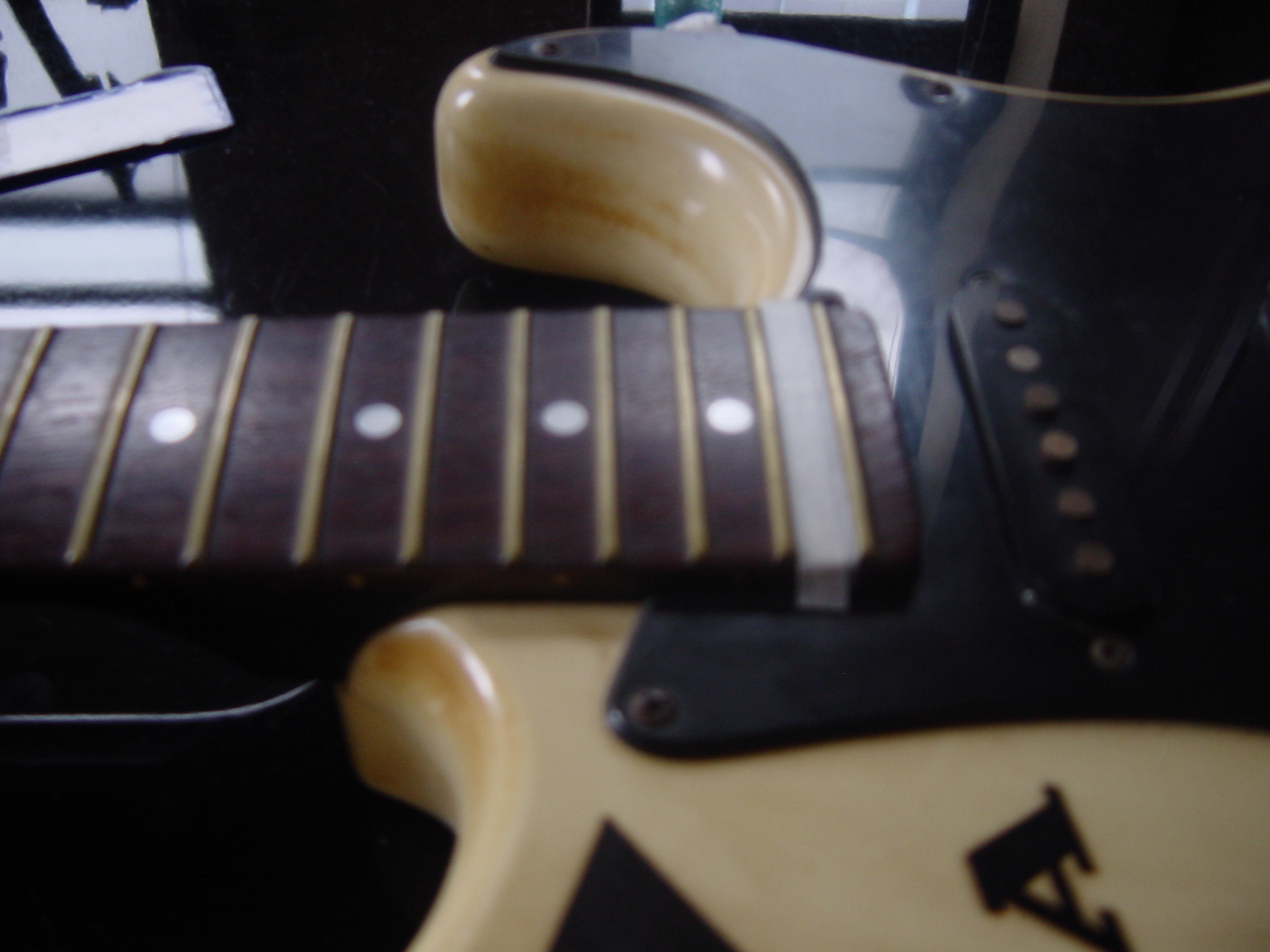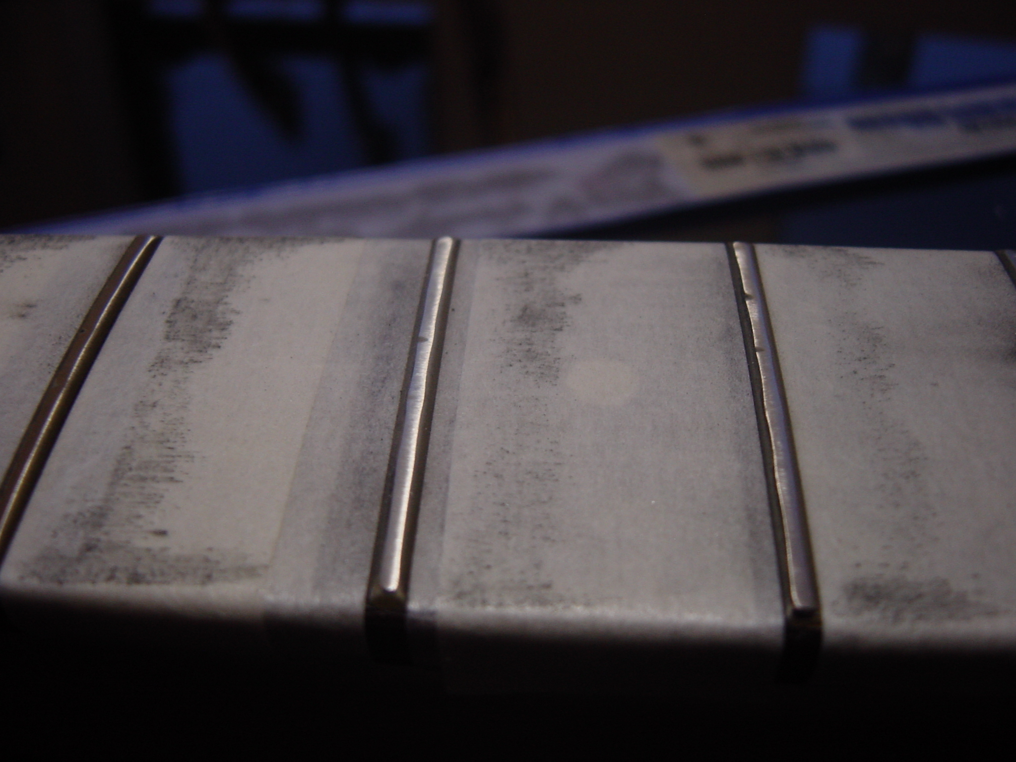 なおマジックで塗る前のフレットの状態はこっち。弦の当たる